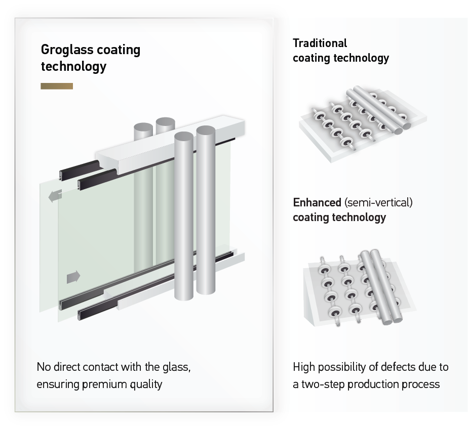 This method significantly minimizes defects by preventing particles from settling on the glass and minimizing handling during the coating process. This innovative approach ensures that each pane of Artglass offers unmatched clarity and uniformity on sizes up to 2210 x 3252 mm.